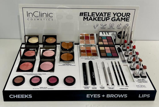 INCLINIC DISPLAY CHEEK, EYES + BROWS & LIPS 3 VERKOOP 1 GRATIS TESTER