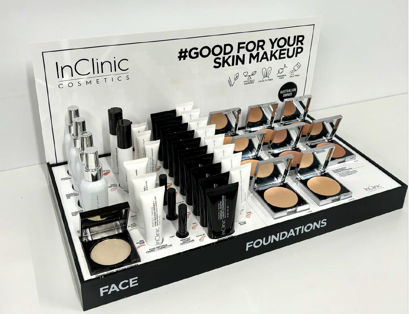 L'INCLINIC DISPLAY FACE & FOUNDATION est livré avec 3 produits de vente par article et 1 testeur gratuit de tous les produits et un présentoir gratuit.